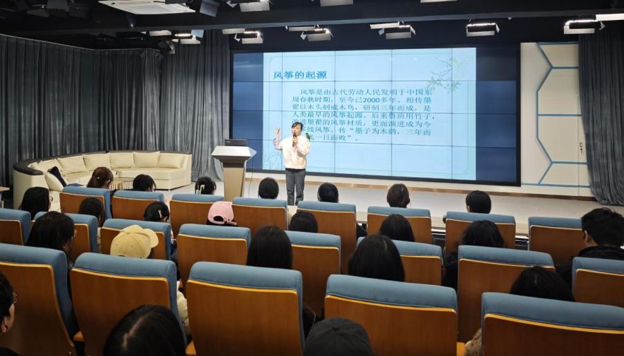 讲座前,申晓晶为宋长虹老师颁发“美育导师”聘书。讲座中,宋长虹老师以“穿越千年的风筝”为题,系统地讲解了中国风筝的起源、寓意和派别,中外风筝特色和比较,宋室风筝从传统到创新的传承之路等,尤其展现了宋室风筝传承人的矢志不渝、追求卓越的职业操守。在知识讲解的过程中,宋老师还围绕风筝历史、制作、图案等设计了简单题目进行了现场互动,同学们踊跃举手抢答,现场气氛热烈,掌声不断。