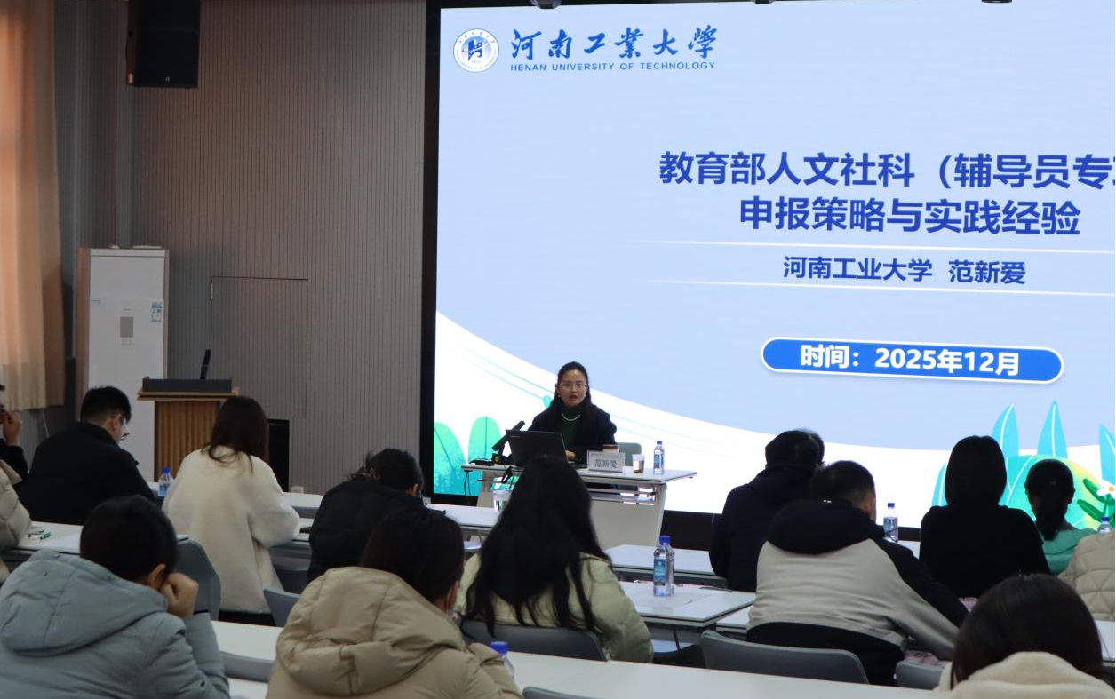 12月15日下午,我校在东校区07B401心理情景剧场举办“教育部人文社会科学研究项目(高校辅导员专项)申报策略与实践经验”专题讲座,主讲人为河南工业大学化学化工学院党委副书记、工会主席范新爱副教授。本次讲座由党委学生工作部、学生处和蓝天书院联合主办,各学院党委(党支部)副书记、辅导员等相关人员参加。