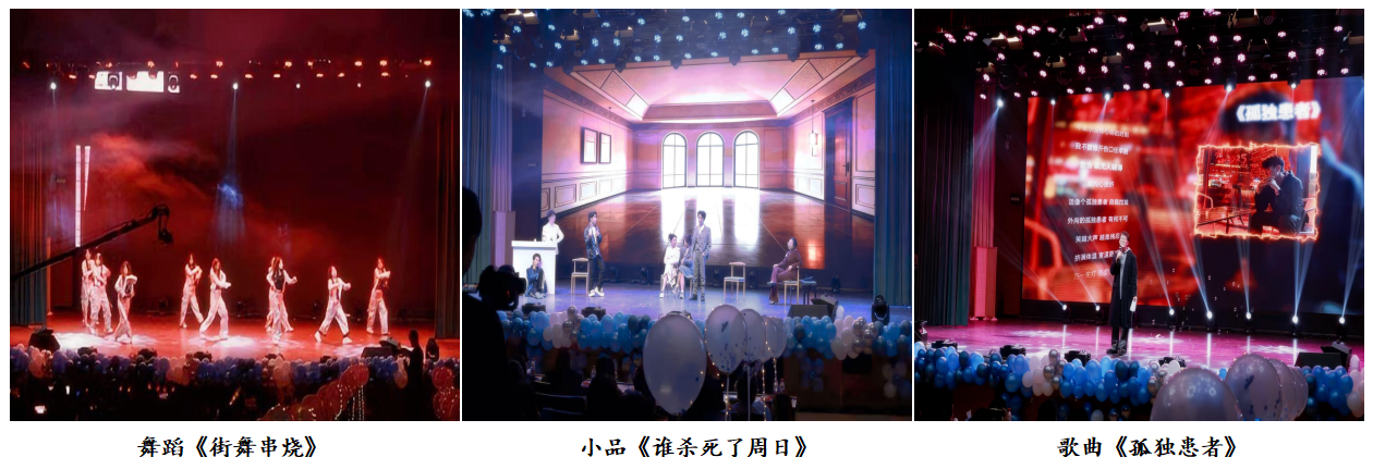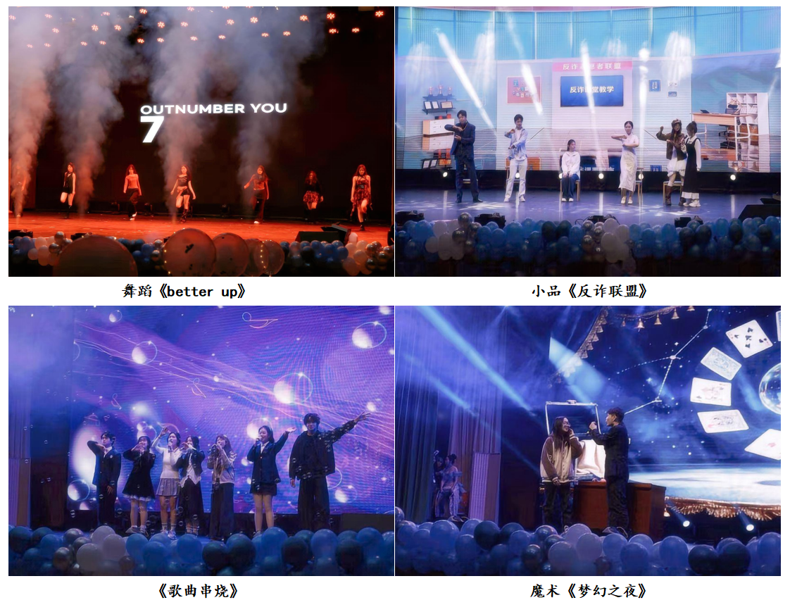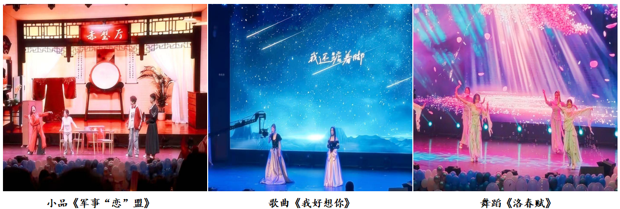 表彰大会结束后,迎新年文艺展演精彩上演。本次展演以“蓝天书雅韵,五育贺元春”为主题,分为“青春·逐光”“韶华·绽彩”“暖韵·迎新”三个篇章,节目形式涵盖歌曲、舞蹈、小品、魔术、游戏互动等,全方位展现了书院学子的青春风采与艺术素养。开场《街舞串烧》动感十足,瞬间点燃现场气氛;舞蹈《洛春赋》尽显东方美学的空灵与雅致;歌曲《孤独患者》《歌曲串烧》和《我好想你》,用细腻旋律与真挚歌声传递人间百态与家国情怀;魔术《梦幻之夜》与现场观众互动不断,惊喜连连;小品《谁杀死了周日》《反诈联盟》和《军事“恋”盟》,以幽默诙谐的方式再现了大学的学习生活场景,展现当代大学生的积极向上态度,富有深刻的教育意义。