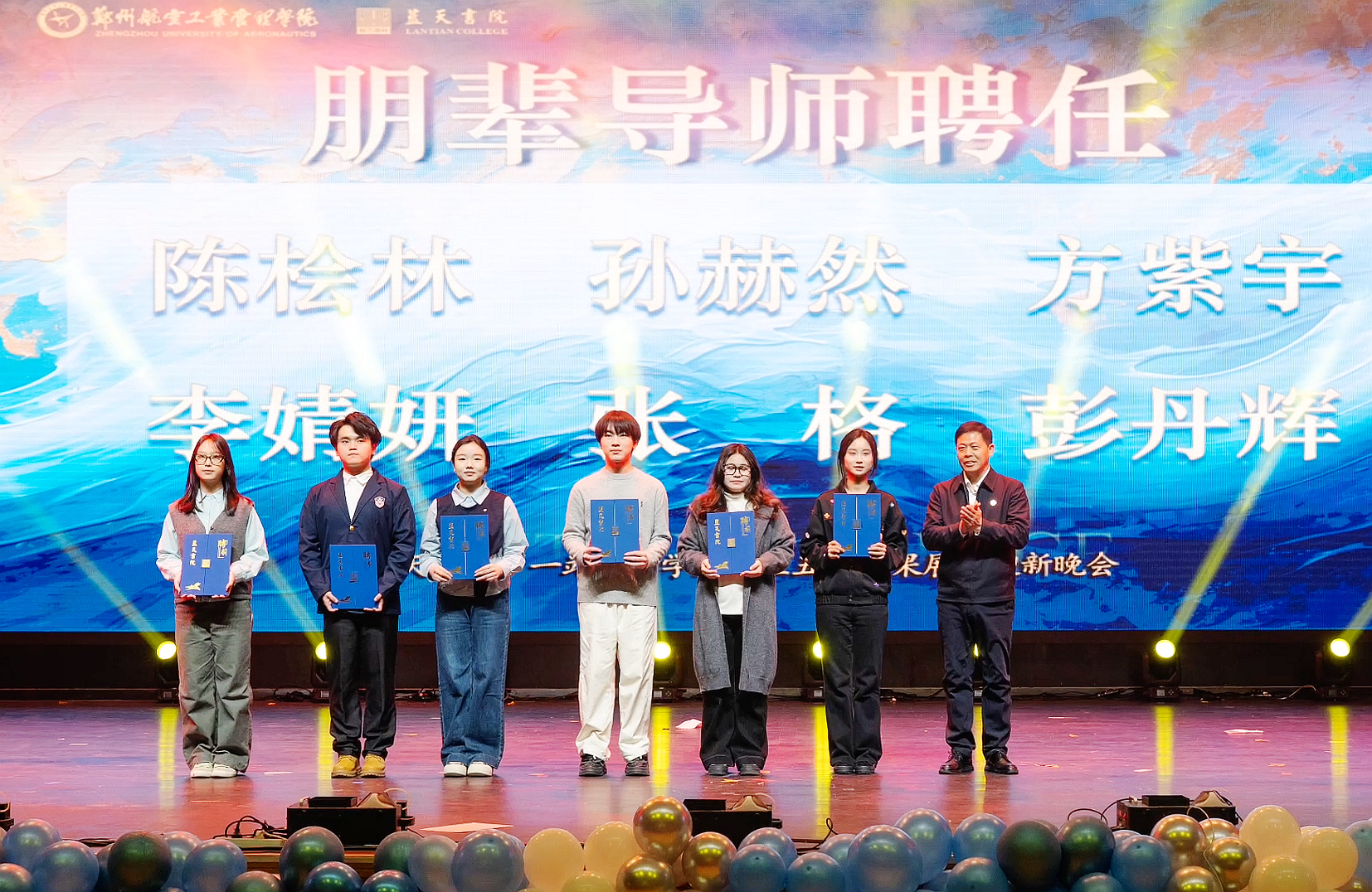 这一年,蓝天书院深化全员育人、全过程育人、全方位育人格局,健全朋辈引领与学业指导长效机制。本次表彰特别设置“朋辈导师”聘任环节,旨在进一步凝聚榜样力量,陪伴新生适应成长,在全院范围共同营造互帮互助、共同成长的育人氛围,为优良学风提供坚实保障。在热烈的掌声中,校党委副书记李广锋为新聘任的2025级朋辈导师代表颁发了聘任证书。