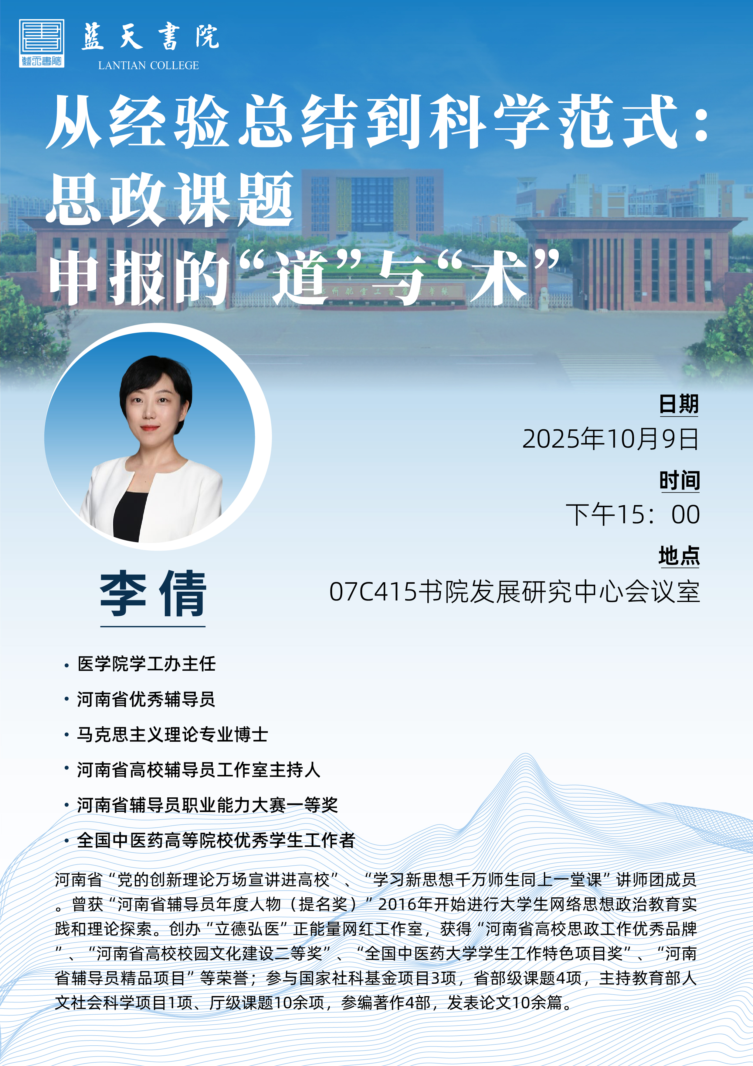 主讲人简介:李倩,医学院学工办主任,河南省优秀辅导员,马克思主义理论专业博士,河南省高校辅导员工作室主持人,河南省辅导员职业能力大赛一等奖,全国中医药高等院校优秀学生工作者;河南省“党的创新理论万场宣讲进高校”、“学习新思想千万师生同上一堂课”讲师团成员曾获“河南省辅导员年度人物(提名奖)"2016年开始进行大学生网络思想政治教育实践和理论探索。创办“立德弘医”正能量网红工作室,获得“河南省高校思政工作优秀品牌、“河南省高校校园文化建设二等奖”、“全国中医药大学学生工作特色项目奖”、“河南省辅导员精品项目”等荣誉;参与国家社科基金项目3项,省部级课题4项,主持教育部人文社会科学项目1项、厅级课题10余项,参编著作4部,发表论文10余篇。