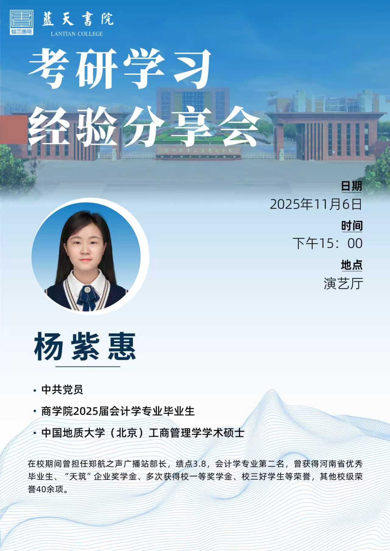 主讲人简介:杨紫惠,中共党员,商学院2025届会计学专业毕业生,中国地质大学(北京)工商管理学学术硕士,在校期间曾担任郑航之声广播站部长,绩点3.8,会计学专业第二名,曾获得河南省优秀毕业生、“天筑”企业奖学金、多次获得校一等奖学金、校三好学生等荣誉,其他校级荣誉40余项。