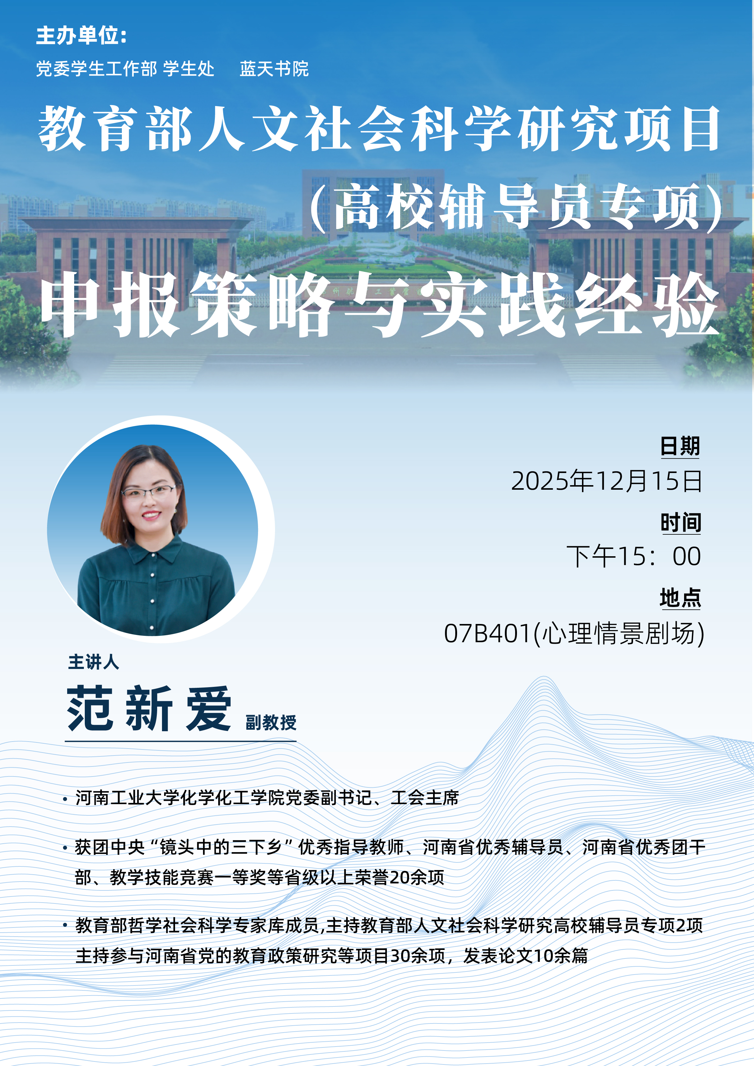 主讲人简介:范新爱,河南工业大学化学化工学院党委副书记、工会主席,获团中央“镜头中的三下乡”优秀指导教师、河南省优秀辅导员、河南省优秀团干部、教学技能竞赛一等奖等省级以上荣誉20余项,教育部哲学社会科学专家库成员,主持教育部人文社会科学研究高校辅导员专项2项,主持参与河南省党的教育政策研究等项目30余项,发表论文10余篇。